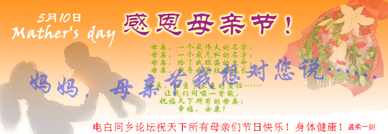 QUOTE(不差钱 @ 2009年05月10日 Sunday, 12:44 AM) 可怜天下父母心,常回家看看,回家看看. 得意时,不要忘了他们,请给他们捎去一丝喜悦. 失意时,不要抱怨他们,反而应该心平气和慰藉一声. 母亲的恩情深似海,祝愿天下母亲们母亲节快乐!!! [snapback]2760292[/snapback]