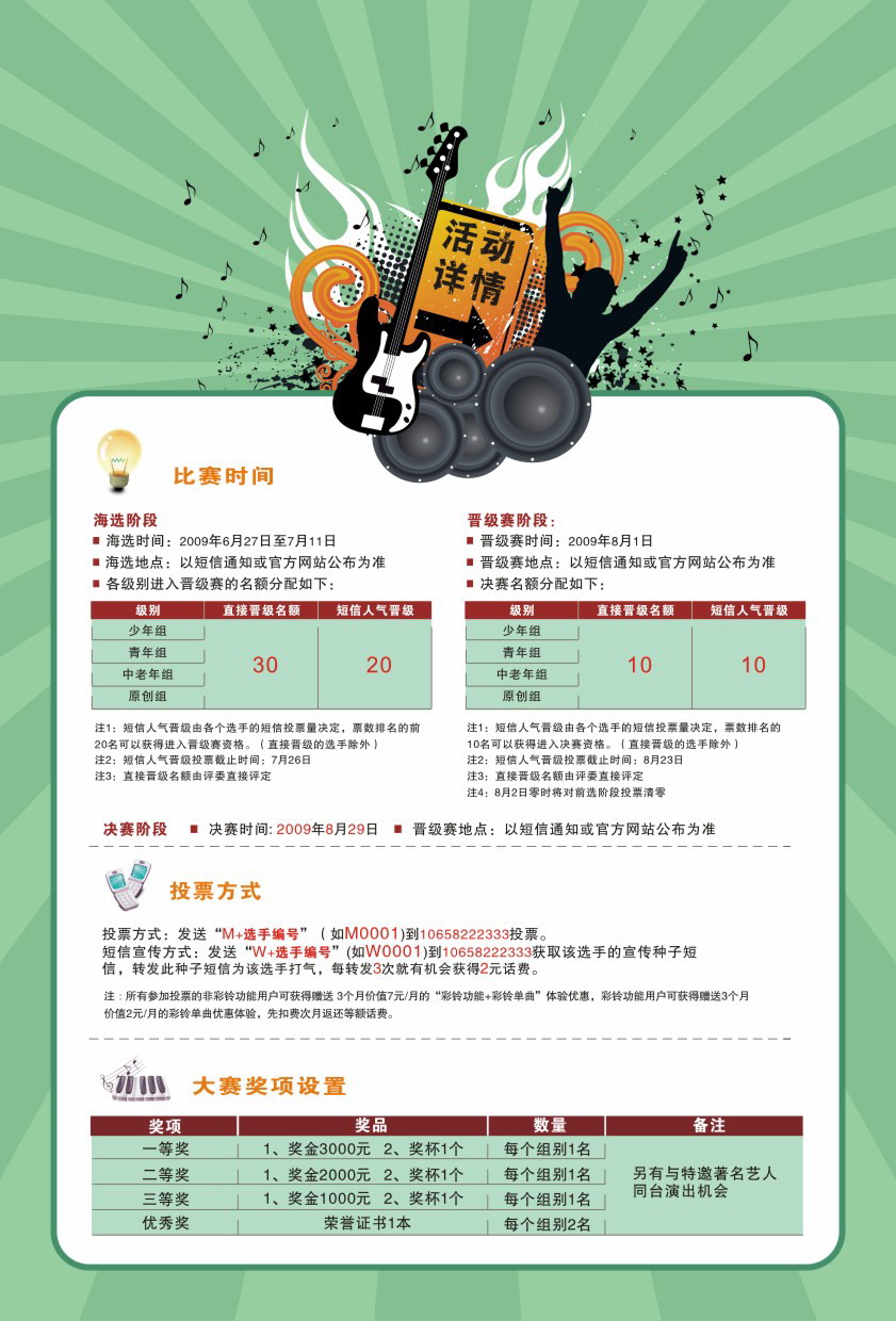 所有报名参赛用户赠送3个月价值5元的彩铃功能和价值2元的无线音乐彩铃一首(非彩铃功能用户),或赠送3个月价值2元的无线音乐彩铃一首(彩铃功能用户),先扣费后返还。其所有报名短信费用按正常短信资费收取(1毛/条)。