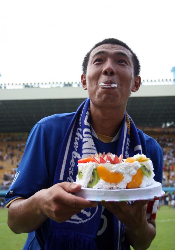 8月12日是队长徐亮的生日,昨天比赛结束后,球迷提前把生日蛋糕送给了他。这是连续两轮后,广药队的两位队长李志海和徐亮相继收到球迷的生日礼物。