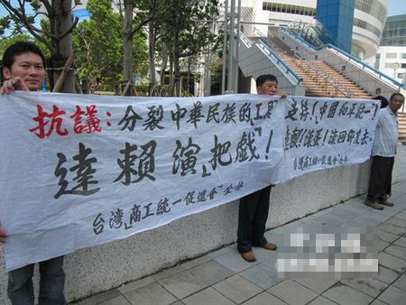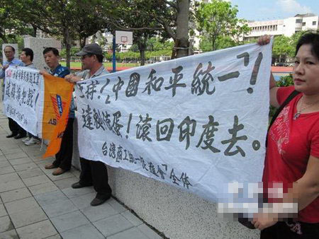 星岛环球网消息:8月30日抵达台湾的达赖,9月1日在高雄巨蛋举行祈福法会,为灾民消灾解厄。不过,场外甚不平静,数十位商工统一促进会的成员,在法会现场外面举起白布条抗议,抗议达赖是分裂中华民族的工具,要他“滚回印度去”。