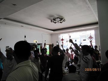 中午,镇领导、社会各界人士和各村球迷与代表团全体成员在环城酒店举行庆功酒会,摆酒席30台,气氛非常热烈,好一片喜庆的景象,赴宴者个个神采飞扬,脸上洋溢着幸福和喜悦。