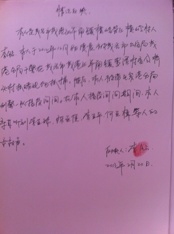 您好!感谢您在百忙中抽空阅看这封信。本人李柯寿,是茂名市茂港区羊角镇罗浮村委会桥头村人,于2012年12月8日凌晨1时无辜被茂名市公安局茂港分局刑警一队干警抓捕后,更被暴力殴打,严刑逼供,现将上述不法事实向领导同志详细反映如下: