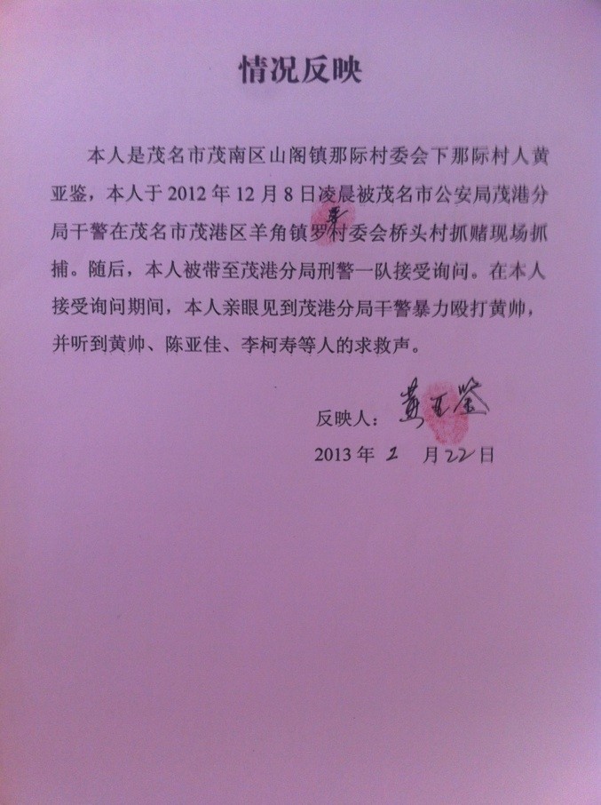 同时,本人还想反映被无辜抓捕到茂港分局刑警一队后,无意中看到的情况:当本人路径本镇元田管区两脚村人陈亚佳所在的询问室,看见陈亚佳已全身湿透,身上只着短袖衣衫,就在当时被人从后背猛踢一脚,接着听到陈亚佳旁边有人大喊一声“跪下”,后陈亚佳所在询问室门被紧闭,门关后本人仍可以听到屋内有暴力殴打捶击声,和陈亚佳的哀求声……还有,本村李亚球也被带到了本人被刑讯的对面房间,曾看到有人拿着60公分粗大的木棍进入对面房间,而后房间传出了李亚球惨叫的求救声……结合上述情况,本人发现严刑逼供存在普遍性,每个被拘传到询问室调查有关人员,无论是否有过违法犯罪事实,均遭受到了暴力殴打,严刑逼供,这样的询问方式是不人道的,不合法的,不道德的、严重违法的!