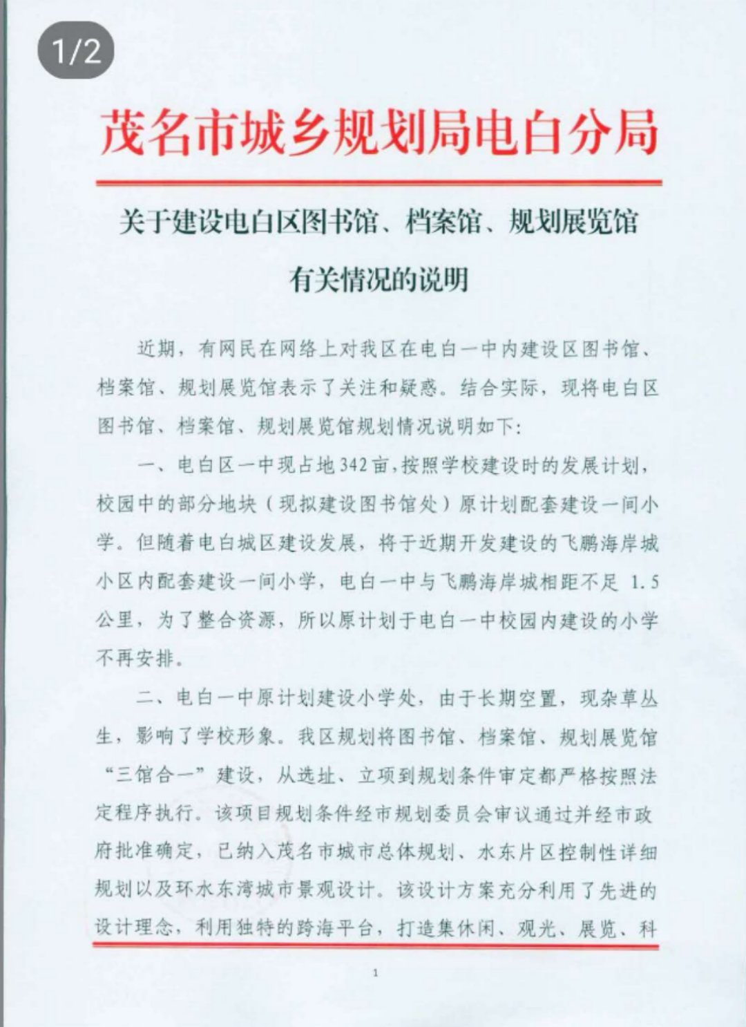 近期,有网民在网络上对我区在电白一中内建设区图书馆、档案馆、规划展览馆表示了关注和疑惑。结合实际,现将电白区图书馆、档案馆、规划展览馆规划情况说明如下:
