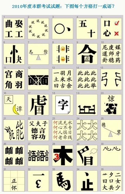 不是吧?还有这东西玩?1.异曲同工 2. 3. 4.一五一十 5.口是心非 6.心直口快 7.无与伦比 8.啼笑皆非 9.里应外合 12.面目全非 14多此一举 15左右开弓 16天方夜谭 17 18.白纸黑字 19. 20石破惊天 24四大皆空 25德高望重26四脚朝天 31正中下怀 33马失前蹄 34点到即止 35莫名其妙