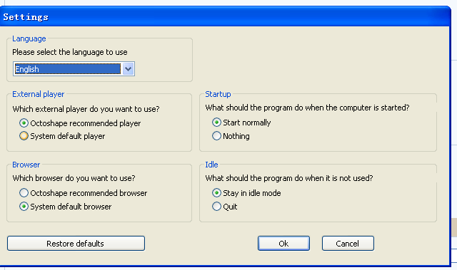 2、对图标单击右键,选择setting->(language:可以选为中文,E文OK的可以跳过language设置)->external player:选system default player->ok 见图1