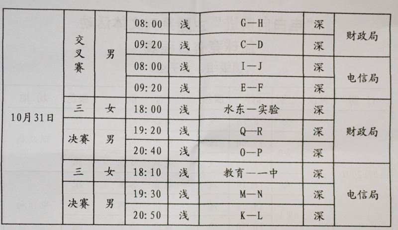 经过三天的小组赛 各队伍在小组中的最终名次(按积分高低排定) A组:树仔、霞洞、那霍、观珠、陈村 B组:水东、电城、沙琅、林头 按规程A组第5和B组第4排一场附加赛,决出最后一名八强席位,附加赛林头胜出。 今晚八强对阵: 19:00 观珠(A4)VS水东(B1) 20:20 下洞(A2)VS沙琅(B3) 比赛地点:财政局 19:00 树仔(A1)VS林头(B4) 20:20 那霍(A3)VS 电城(B2) 比赛地点电信局