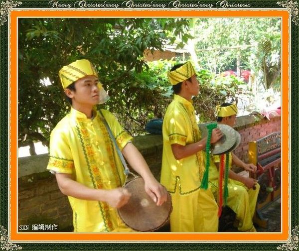 傣族小伙子敲锣打鼓欢迎远方的客人