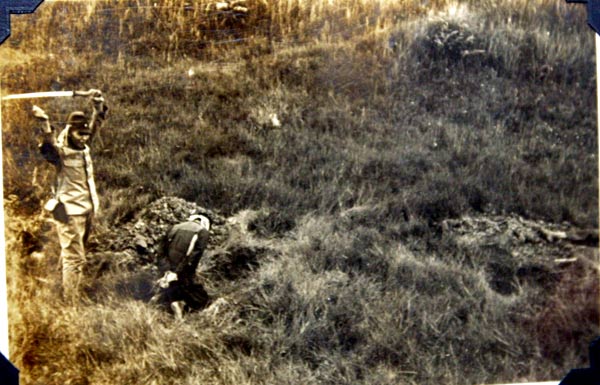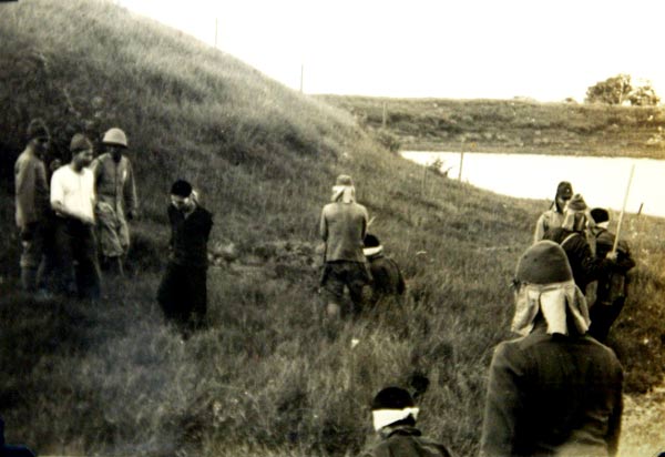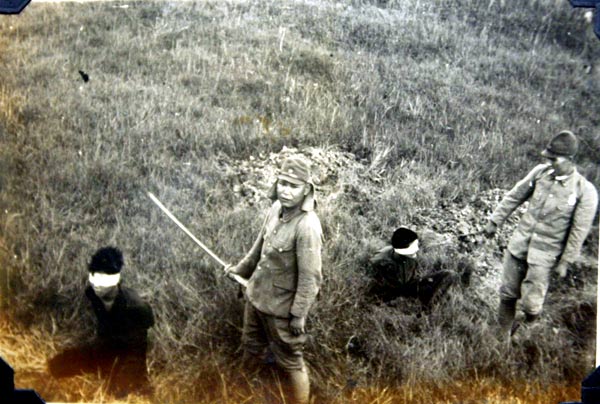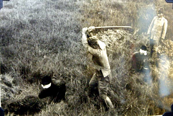 "......分别是几名日本兵拿着雪亮的军刀押着4名中国人在草地里行走,两名中国人被白布蒙着眼,表情紧张地跪在了日本兵的面前,日本兵举起了军刀,摆出了“手起刀落”的架势,然后是日本兵砍下了中国人的头颅。