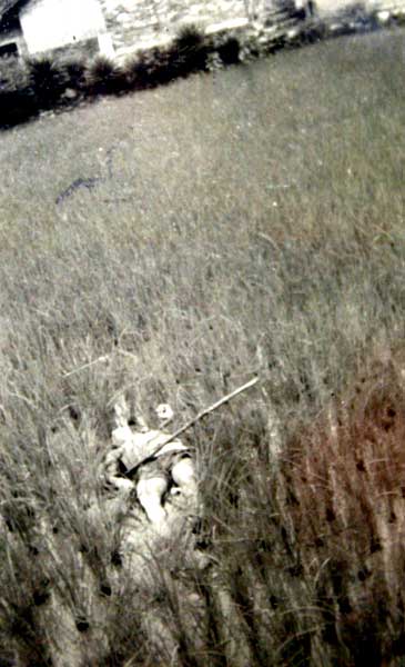 "在日本侵略者的铁蹄下,中国人民受到的伤害还不只是成为“砍人游戏”的对象,有的百姓走在回家的路上,便被日军用冷枪放倒。在离“砍人游戏”照片仅几页的地方,就有一张农民倒在水稻田里的照片,其胸部有中弹的迹象(见下图)"