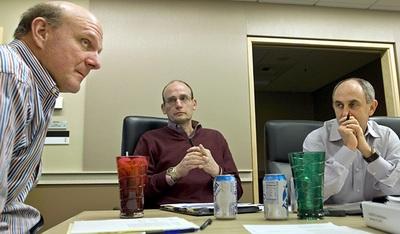 下午2:30,鲍尔默与微软CFO Christopher Liddell(右)与微软商业解决方案部门CFO Craig Bruya(中)开会