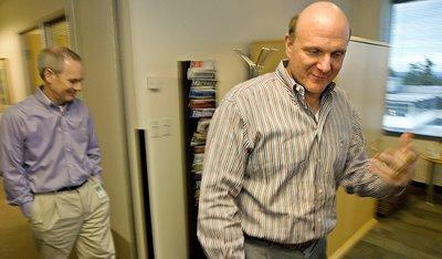 下午4:14,鲍尔默刚刚与微软Office商业平台部门副总裁Kurt Delbene(左)开完会,两人一起走向另一间会议室,那里还有一场会等着他们