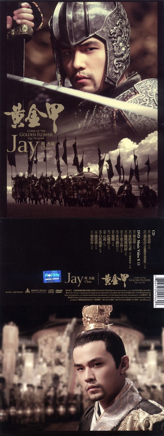 1.【 黄金甲】---国际大导演张艺谋执导,由周润发、巩俐与周杰伦联合主演的「满城尽带黄金甲」电影主题曲。此曲周杰伦延续坚持不变的 中国风元素,硬蕊摇滚混合街头饶舌,强而有劲的节奏呈现了电影中千军万马的磅R气势。周式中国风,依然大显神通!