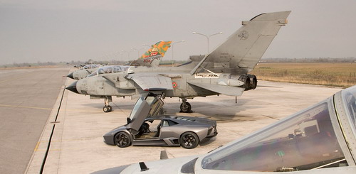 虽不能翱翔蓝天,但是能够单挑战斗机与之并驾齐驱是所有超级跑车奋斗的最终目标。近日,位于意大利北部的Ghedi空军基地:意大利空军的A200-A Tornado狂风式战斗机,与同样来自意大利的兰博基尼限量超级跑车Reventon,进行了一场陆空跨界加速大赛。
