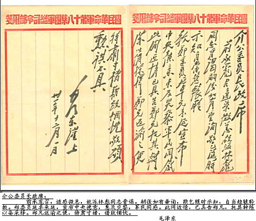 毛泽东给蒋介石的一封信 1938年9月29日,毛泽东就武汉会战致国民政府蒋委员长的一封信,盛赞政府及蒋本人之抗日决心与辉煌成就,这封由周恩来带到武汉的信件,载入人民出版社出版的《毛泽东书信选集》,全文如下: 介石先生惠鉴: 恩来诸同志回延安称述先生盛德,钦佩无余。先生指导全民族进行空前伟大的民族革命战争,凡我国人无不崇仰。 十五个月之抗战,愈挫愈奋,再接再厉,虽顽寇尚未戢其凶锋,然胜利之始基,业已奠定,前途之光明,希望无穷。此次,敝党中央六次全会,一致认为抗战形势有渐次进入一新阶段之趋势。此阶段之特点,将是一方面更加困难;然又一方面必更加进步,而其任务在于团结全民,巩固与扩大抗日阵线,坚持持久战争,动员新生力量,克服困难,准备反攻。在此过程中,敌人必利用欧洲事变与吾国弱点,策动各种不利于全国统一团结之破坏阴谋。 因此,同人认为此时期中之统一团结,比任何时期为重要。惟有各党各派及全国人民克尽最善之努力,在先生统一领导之下,严防与击破敌人之破坏阴谋,清洗国人之悲观情绪,提高民族觉悟及胜利信心,并施行新阶段中之必要的战时政策,方能达到停止敌人之进攻,准备我之反攻之目的。因武汉紧张,故欲恩来同志不待会议完毕,即行返汉,晋谒先生,商承一切,未尽之意,概托恩来先生面陈。 此时此际,国共两党,休戚与共,亦即长期战争与长期团结之重要关节。泽东坚决相信,国共两党终必能于长期的艰苦奋斗中,克服困难,准备力量,实行反攻,驱逐顽寇,而使自己雄立于东亚。 此物此志,知先生必有同心也。专此布臆。敬祝健康!并致民族革命之礼! 毛泽东谨启 民国二十七年九月二十九日 介公委员长政席: 前承宠召适染微恙,故派林彪同志晋谒。嗣後如有垂询,敬乞随时示知,自当趋辕聆教。郑委员延卓兄来延宣布中央德意东及尖黎军民同感此间近情,已具告郑兄托其转陈,以备采择。郑兄返渝之便,特肃寸楮藉致悃忱敬颂勋祺不具 毛泽东谨上