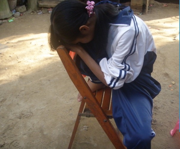 到她家探访时看到她之后心痛而心酸地流泪,备感无奈!看到她因痛到无法站,坐,睡,只能艰难的扒在椅子上找依靠。可想她的痛苦谁能分担???就连晚上睡觉也是这个姿势!苍天啊!!!病魔夺走了她该有的校园生活和应有的快乐。