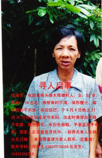今天听到一个很不好的消息,十几年老同的母亲走失了,知道这事心里很不是滋味。我们虽没有血缘关系,但我们是十几年的同学,如兄弟姐妹般。我身在广州,没能够亲自去寻找,但应该尽自己的心,尽自己的力,如此才能不枉为老同。希望这是虚惊一场,有惊无险。妈妈早日回家……