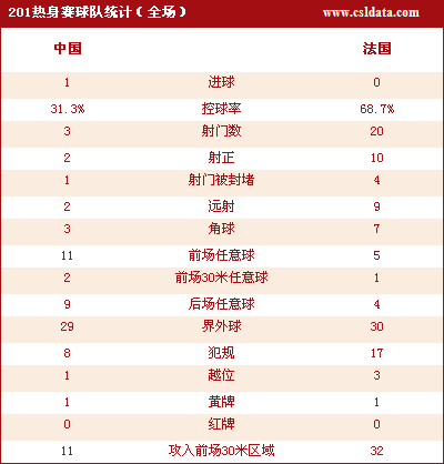 随比赛深入,中国队已是防守反击态势,法国队阵型则持续前压。第27分钟,马卢达斜传中国队禁区中路,阿内尔卡胸停调整后攻门打高。1分钟后里贝里左侧摆脱传中,荣昊及时协防将球断下,并准确前传右翼空档,在曲波快速前插同时,法国队门将洛里斯冲出禁区将球破坏。第31分钟,古尔库夫中路摆脱后大力低射被曾诚侧扑拦截。3分钟后法国队右侧角球传至中国队禁区中路,加拉头球攻门稍顶偏。