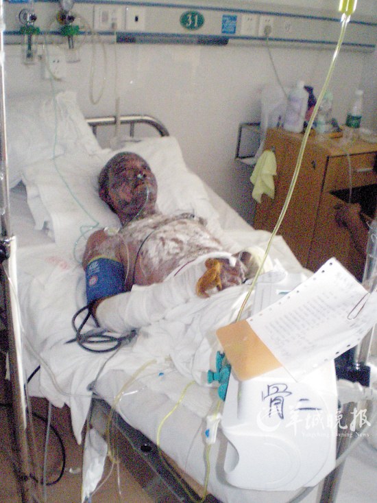 老人名叫林×芬,今年已60多岁,在病房守护的大儿子和三儿子告诉羊城晚报记者:他们家三兄弟都在外面做生意,平时并没有与别人有什么过节,更没结下任何仇口。因何遭此灾变?他们把矛头指向自家的堂叔林×喜。据称此人今年40岁,已婚,并育有儿女,但平时游手好闲,不务正业,没有钱花就找林×芬家要。但去年林×喜沾上了吸食K粉和麻古的恶习,这引起了林×芬家人的不满,于是停止供钱给他,这可能引起了林×喜的不满。事发当晚,凶手子夜时分将林×芬家的大门反锁,并抱来了邻居的许多花生梗堆在门口,浇上煤油,然后点着了火,迅速离去。林×芬首先被大火惊醒,试图打开门让家人逃生,不料大火随风扑来,林伯即时成了一个火人。呼救声招来邻居们,将林×芬的老伴和两个孩子救了出去,林×芬随后被送往茂名市人民医院抢救。