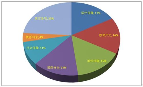 自二次大战以来,在美国政府财政开支中,社会保障(包括养老、医疗等在内)、教育和国防是美国政府财政开支中最大的项目,尤其是社会保障,目前已经超过了美国政府开支的50%。例如在美国2010年,根据美国政府公布的数据,美国联邦、州和地方三级政府财政65320亿美元,其开支大体情况如下: