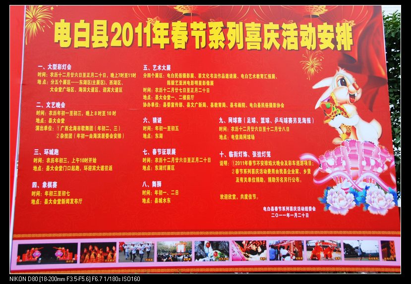 由于暂时无法在2楼更新... 因此在这里更新... 给力2011`水东春节游玩指南 NO.① 一、为了营造欢乐祥和的节日气氛,县委、县政府多方筹措资金,举办2011年春节喜庆活动。活动安排如下: 1、大型彩灯会 时间:1月29日(农历十二月廿六日)至2月22日(正月二十日) 晚上7时至11时 地点:东湖区(主展区)、西湖区、大会堂广场区、海滨大道区、迎宾大道区 注:大型彩灯会亮灯仪式于1月29日(农历12月26日)晚8时在迎春门楼前举行 2、文艺晚会 时间:2月3日(年初一)至2月5日(年初三) 晚上8时至10时 地点:县大会堂 演出单位:①广西北海市歌舞团(年初二、三) ②杂技团(年初一由海滨居委会安排) 3、环城跑 时间:2月5日(年初三) 上午10时开始 地点:县大会堂门口起跑,环迎宾大道往返 4、象棋赛 时间:2月5日(年初三)至2月9日(年初七) 地点:县大会堂新闻发布厅 5、艺术展 展区:电白民俗摄影展、茶文化书法作品邀请展、电白艺术教育汇报展、陈毅艺亚洲电影明星影像展 时间:1月30日(农历十二月廿七)日至2月22日(正月二十日) 地点:县大会堂一、二楼前厅 6、猜谜 时间:2月3日(年初一)至2月7日(年初五) 地点:东湖 7、春节征联展 时间:1月29日(农历十二月廿六)日至2月22日(正月二十日) 地点:东湖灯展区 8、舞狮 时间:2月3、4日(年初一、二日) 地点:县城水东 9、网球赛(足球、篮球、兵乓球另见海报) 时间:1月29日(农历十二月廿六日)至1月31日(农历十二月廿八日) 地点:电信局网球场 10、临街灯饰、张挂灯笼 说明:①2011年春节不安排焰火晚会及彩车巡游项目; 欢迎欣赏,共度佳节。