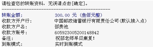 感谢在茂名工作QQ名为“梦季の恋”的女士为邵老师捐款
