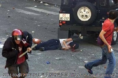 2001年意大利热那亚8国峰会期间,Carlo Giuliani 23岁青年在砸一辆满载宪兵的警车时被车内宪兵当场开枪打死(用的像92f手枪)现场记者记录下了整个过程。 [attachmentid=271685] [attachmentid=271686] [attachmentid=271687] [attachmentid=271688]