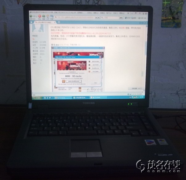 CPU是迅驰二代PM750 1.86G(2m),两条512MDDR2内存组双通道,集显128M,40G串口硬盘,带无线,电池待机1个半小时。 750元(不刀)求秒,爽快的送升级留下的迅驰赛扬M360(1.4G,1M).QQ943467321 包无病痛,任试!15寸屏幕完美无斑无点。看高清流畅,一般游戏也没有压力。集成128M显卡,3DMARK2001测试有5000分左右。 上传刚刚用水机照的笔记本图