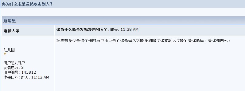自 自强不息,博学致远 大学二年级 注册 2011-09-16 消息 759 反馈评分 0 点数 0 2011-12-16 #1 [attachmentid=287160] 八呵呵“电城人家”呐,做事要光明正大,别注册一个新马甲出来马鲁溜。 早鲁鸭呐,投票关鲁螺事啊,看来鲁是投票名单中其中一个。 队鲁奖呐,好似我无攻击鲁老母哇? 鲁老母无鸡吗?要不然一出来就鸡鸡鸡。 八塔塔鲁老井,鲁无事做就早点去死,映隼聪壮蟆 讲鲁知,要人身攻击,要问候家庭成员,我可以天天不定时向你家全体女性问候。 谁无家人呢,“电城人家”鲁何必呢? 附件 11111.jpg 33.7 KB · 查看: 207