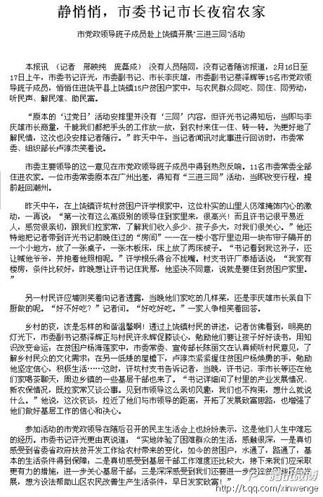 西施妹妹 小学二年级 注册 2012-02-02 消息 154 反馈评分 0 点数 0 2012-02-18 #1 [attachmentid=291216] 潮州市委书记、市长等11名市委常委“悄悄”夜宿农家 附件 111.jpg 144.4 KB · 查看: 355