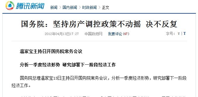 4月13日,国务院常务会议,温家宝:坚持房地产调控政策不动摇,决不让调控出现反复。