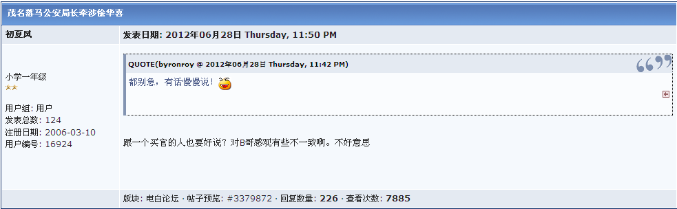 近排论坛热闹得很,小玲事件后又来个徐局事件,我也凑热闹说几句,不求苟同但拒绝县骂。官场的东西本来百姓言论不足以影响方向,在这只是发下牢骚。茂名地震纪委己通报涉及几百名领导,但大老板己发言要挽救犯错的干部,所以除了己捉到的,其他人都采取挽救措施,徐应该都是这批之中。而这批人基本都还在位,为何大家只对徐炮轰呢?应该是他在电白形象正面基多,加上在论坛设置铁sir,所以案件一公布,大家心里就无法接受。具体情况如何我们外人无法了解,就是真的在现时也不奇怪,但以事论事,他们在电白的成绩也不应否定,治安和管理水平在论坛和听社会,公安系统反映,都是好的评价,在论坛设发言更是首创,虽有人骂铁不为他们解决问题,但发言人不是万能,只是渠道,起码它能及时为你解释和解决部分问题,你要他件件办好是不可能的,就是局长都要看上面和老板脸色,何况铁只是主任。