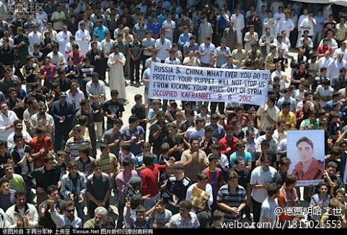 叙利亚群众横幅标语: Russia & China ,what ever youdo to protect your puppet will not stop us from killing your asses out of Syria occupied Kafranbel 8 June 2012