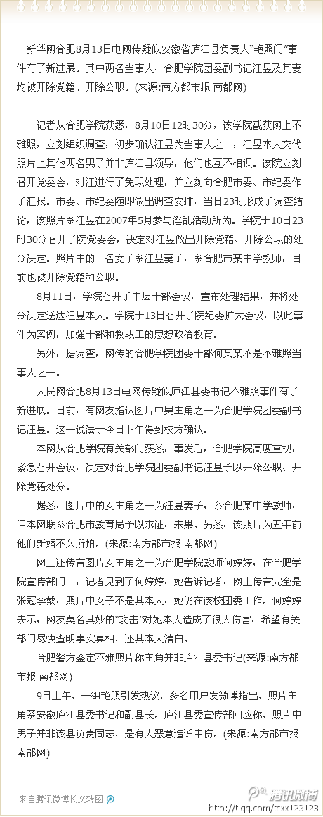 道义有刀 荣誉主席 注册 2011-12-16 消息 4,460 反馈评分 29 点数 71 2012-08-14 #70 QUOTE(自由世界 @ 2012年08月13日 Monday, 08:28 PM) 安徽不雅照2名涉事夫妻被双开 2012-08-13 18:07 来源: 新华网 新华网合肥8月13日电 (记者 王圣 志、鲍晓菁)网传疑似安徽省庐江县负 责人“艳照门”事件有了新进展。其中两 名当事人、合肥学院团委(微博)副书记 汪昱及其妻均被开除党籍、开除公 职。 记者从合肥学院获悉,8月10日12 时30分,该学院截获网上不雅照,立 刻组织调查,初步确认汪昱为当事人 之一,汪昱本人交代照片上其他两名 男子并非庐江县领导,他们也互不相 识。该院立刻召开党委会,对汪进行 了免职处理,并立刻向合肥市委、市 纪委作了汇报。市委、市纪委随即做 出调查安排,当日23时形成了调查结 论,该照片系汪昱在2007年5月参与淫 乱活动所为。学院于10日23时30分召 开了院党委会,决定对汪昱做出开除 党籍、开除公职的处分决定。照片中 的一名女子系汪昱妻子,系合肥市某 中学教师,目前也被开除党籍和公 职。 8月11日,学院召开了中层干部会 议,宣布处理结果,并将处分决定送 达汪昱本人。学院于13日召开了院纪 委扩大会议,以此事件为案例,加强 干部和教职工的思想政治教育。 另外,据调查,网传的合肥学院 团委干部何某某不是不雅照当事人之 一。 [snapback]3402921[/snapback] 档终于行动了,但是怎就抓个小的,还有两位大神怎么处理?