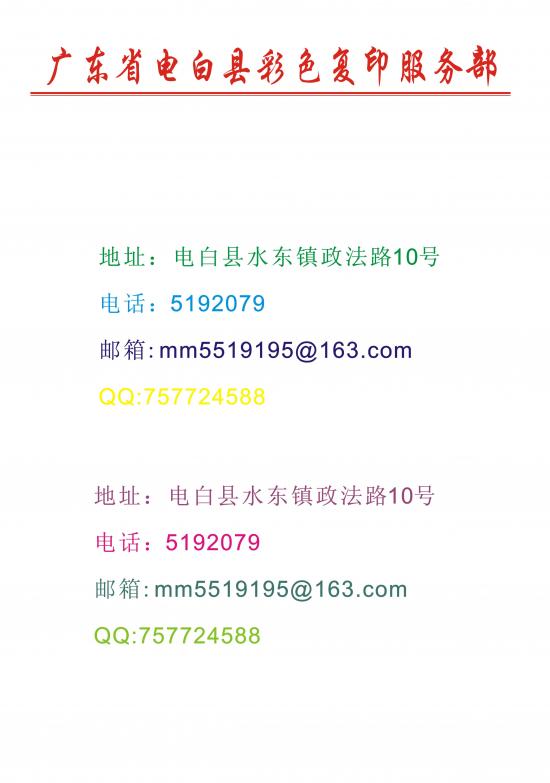 电 电白彩色复印 学前班 注册 2011-11-05 消息 39 反馈评分 0 点数 0 2012-08-25 #1 彩色复印,质量好、效果佳、速度快,价格优惠,欢迎光临! 本店可进行A3彩色激光复印、A3彩色激光打印,A3彩色扫描说是电白论坛网友,更加特惠 黑白、彩色扫描超快,每分钟70张! 名称:电白县彩色复印店 地址:电白县水东镇政法路10号(旧检察院楼下) QQ:757724588 邮箱:mm5519195@163.com 757724588@qq.com 电话:5192079 附加缩略图 附件 post-143016-1322034788_thumb.jpg 32 KB · 查看: 264 图像001.jpg 296.4 KB · 查看: 303