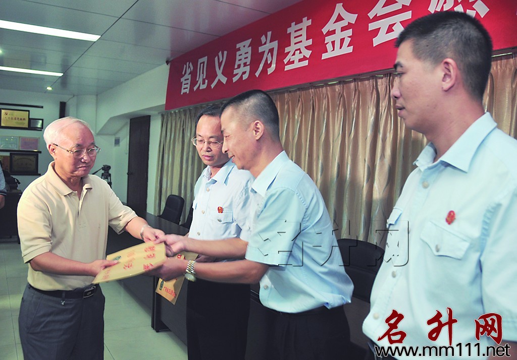 昨日,省见义勇为基金会理事长朱明健向电白3法官颁发慰问金。 本报记者甘杨 松摄