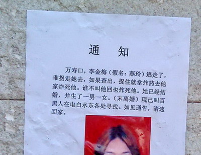声明:这是在路边街招所拍,觉得话语挺雷人的,大括热萑缦:万寿囗?李金梅(假名:燕玲)逃走了,谁拐走她去,如果松,捉住就拿"炸药去他家炸死他,谁不叫他回也炸死他",她已经结婚,并生了一男一女.(未离婚)现已叫百黑人在电白水东各处寻找,如见通告,请速回家.