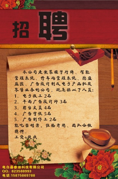 本公司是安装楼宇对讲、智能 管理系统、停车场管理系统、防盗 监控、广告设计制及电子产品批发 零售业务的公司,现急招以下人员: 1。电子技工 2名 2。平面广告设计师 3名 3。前台文员 4名 4。广告学徒 5名 5。广告制作工 2名 能吃苦耐劳,性格开朗、团队合做 精神。 工资+提成