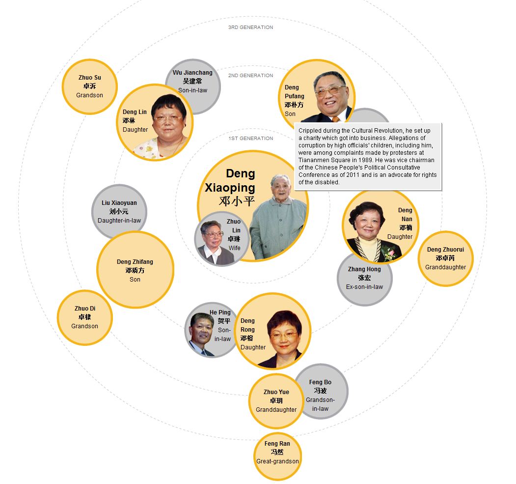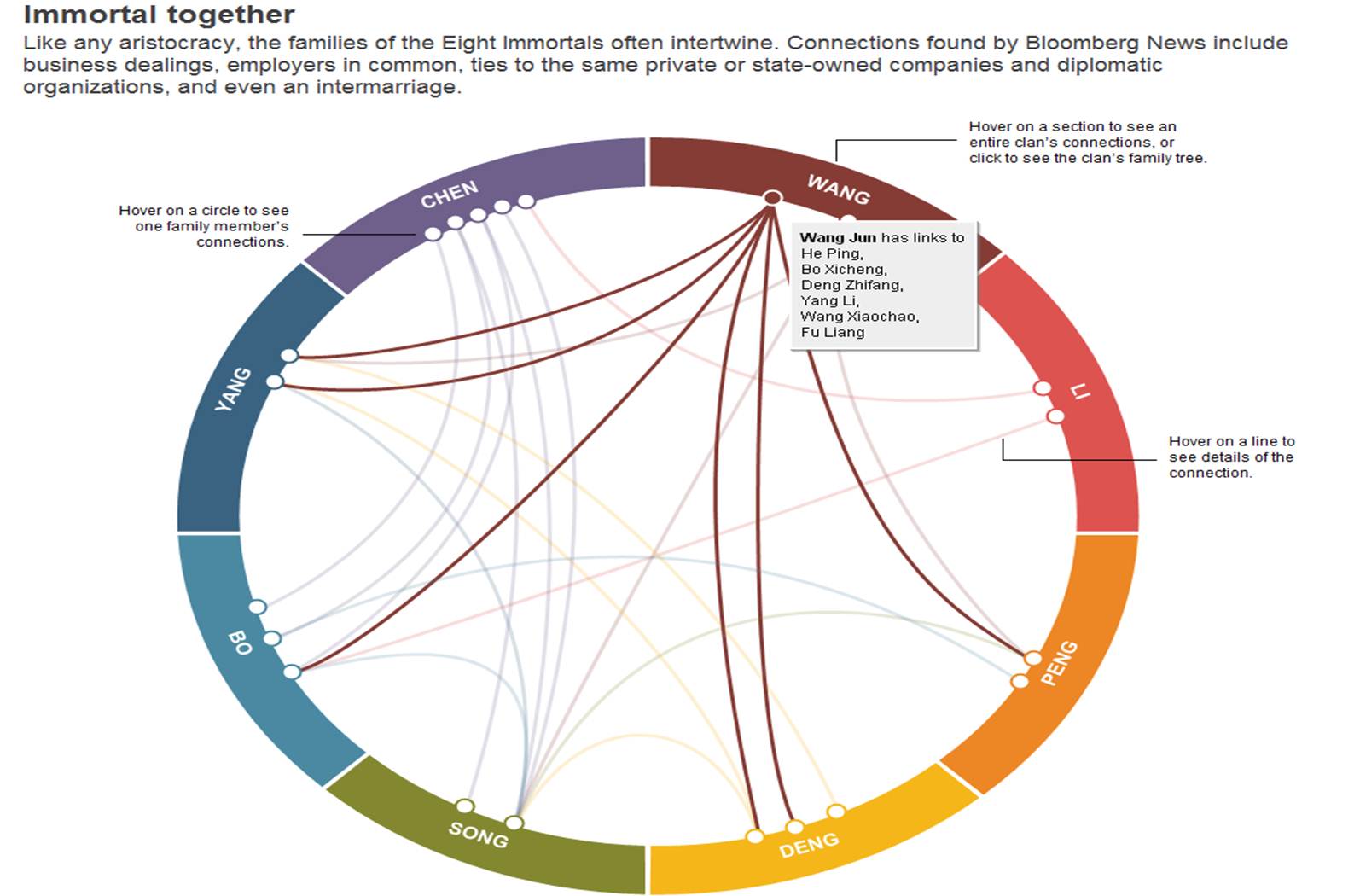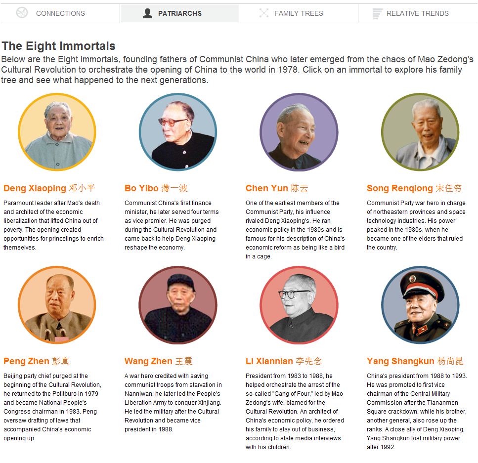 按照彭博编撰的数据,八大元老的直系太子党中至少有26人在国营企业担任高管,控制着中国的经济。按照2011年的数据,其中三人--王震的儿子王军、邓小平的女婿贺平、陈云的儿子陈元,仅这三个人就掌控着1.6万亿美元的国有资产,这已经超出中国年经济产出的五分之一以上。