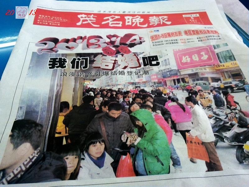 老 老颠 大学二年级 注册 2005-11-23 消息 786 反馈评分 0 点数 1 2013-02-02 #13 水东3 《201314-爱你一生一世》 浪漫谐音引爆结婚登记潮。 [attachmentid=307902] 附件 N3416.jpg 439.3 KB · 查看: 581