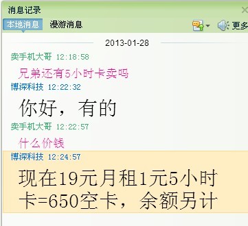 广州卖手机大哥 荣誉会员 荣誉会员 注册 2006-11-01 消息 10,291 反馈评分 48 点数 71 2013-01-28 #31 不过限流量的还是不够爽,记得以前帮人在茂名买过电信卡的,每天一元,包5小时无限量上网,超过5小时的就要3元一小时