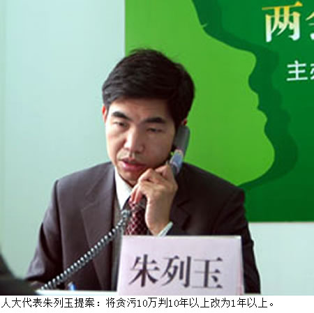 2013年3月2日的媒体报道,全国人大代表朱列玉准备提交《关于修改〈刑法〉中贪污受贿犯罪不合理量刑规定的议案》,建议将刑法中关于个人贪污受贿10元以上的,处10年以上有期徒刑修改为个人贪污受贿10万元以上的,处1年以上有期徒刑。他同时建议,根据经济社会发展程度、人民生活水平和物价指数等因素,每5年对贪污受贿犯罪的量刑标准做相应的调整。