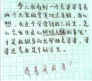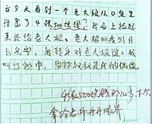我今天看到一个老大娘从口袋里掉出了4张500块钱。我马上捡起来还给老大娘。老大娘问我叫什么名字,我转身对老大娘说,我叫红领巾,雷锋叔叔是我的偶像。