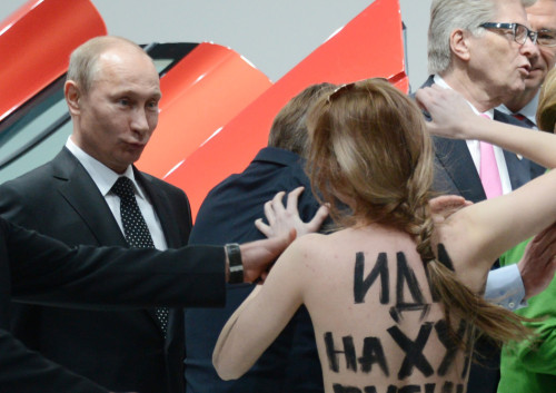 据报道,当普京与德国总理默克尔在汉诺威工业博览会参观时,记者群内的数名女子突然冲破警戒线,来到俄德两国领导人面前,她们脱去上衣,赤裸上身并用英文高喊不文明口号,而且这些口号被事先涂在身体上。