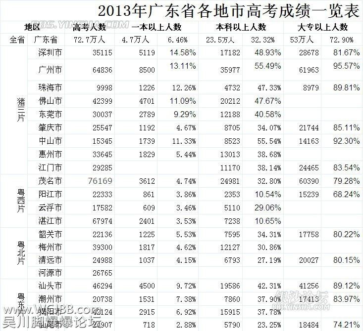 lang 小学四年级 注册 2006-02-10 消息 283 反馈评分 3 点数 1 2013-07-08 #7 茂名本科百分率32.8%,湛江阳江的本科百分率都只有10.6%左右,说明茂名总体教学质量是还可以。当然和珠三角的城市有差距,同肇庆升学率相当。专科上线率并不是倒数第三,上面还有几个城市没公布呢!