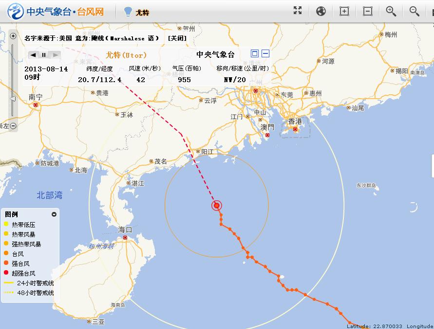 强台风紧急警报_2013年8月14日10时发布 时间:2013-08-14 09:56:51 来源:广东省气象局 今天上午9时,强台风“尤特”中心位于北纬20点7度,东经112点4度,也就是在阳江市东南偏南方向约140公里的海面上,中心附近最大风力14级,达到42米每秒的风速,中心最低气压955百帕,8级大风范围半径约300公里。 预计,强台风“尤特”未来以每小时20公里左右的速度向西北方向移动,将于今天中午到傍晚在阳东到吴川之间沿海地区登陆。
