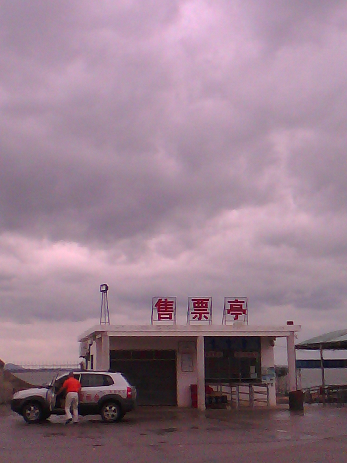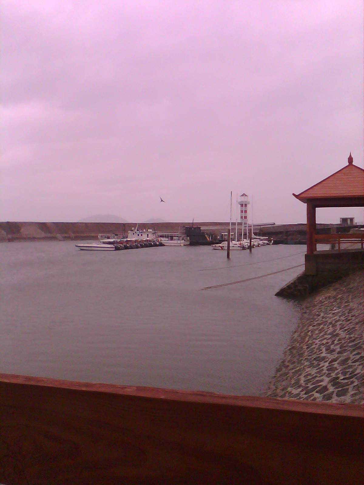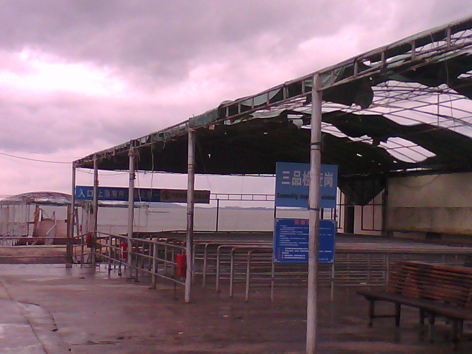 放鸡岛旅游公司渡船回到避风港,风把原上岛候船室屋顶吹烂了……