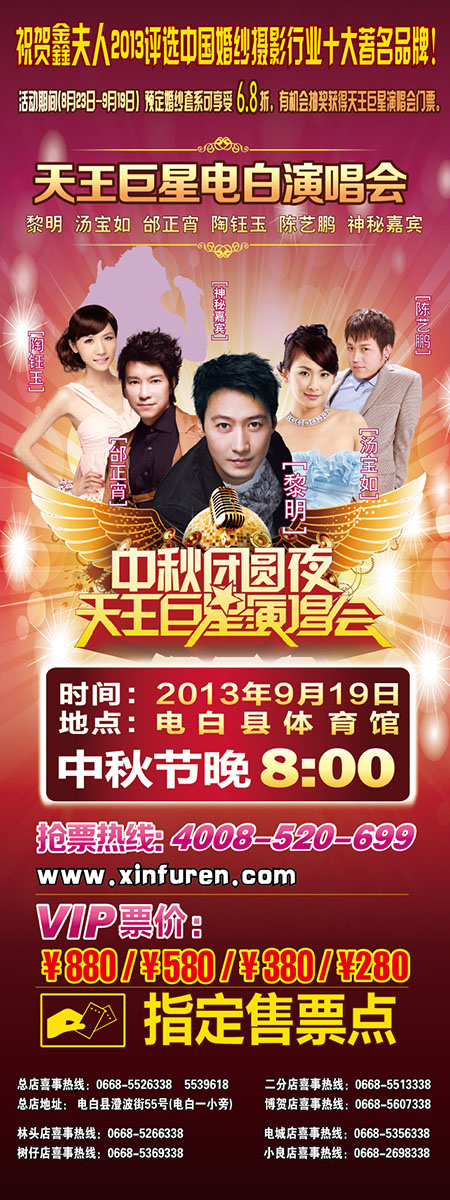 祝贺鑫夫人2013评选中国婚纱摄影行业十大著名品牌!邀请天王巨星(黎明)汤宝如、邰正宵、陶钰玉、陈艺朋等明星9月19号晚8:00电白体育馆与你贺中秋)门票火爆抢购中……凭门票预定婚纱照享受一千元现金券!vip票:¥880/¥580/¥380/¥280,售票咨询:4008-520-699,总票房:指定售票:鑫夫人婚纱摄影 曾经理 13432966138查看更多