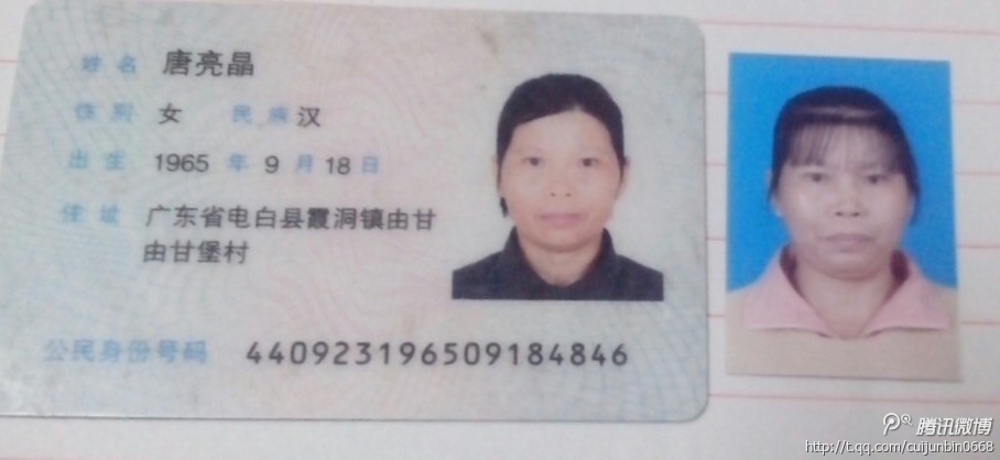 唐亮晶,女,48岁,广东电白霞洞人,身高148,微胖,患有间歇性精神疾病,于2013年10月28号下午6点左右,在霞洞至电白县城水东的路上失去联系,随身带着一个黑棕红色学生书包,可能去往电白,茂名,广州等,她手机自当晚8点起已关机,不能接通。如果您见过她,请联系:崔伟强13580058252,崔俊斌15320301595。请各位多多转发,谢谢了!!!