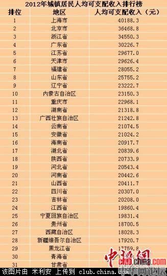 结果显示,上海、北京、浙江这3个地区位列前三名。其中,上海2012年城镇居民人均可支配收入最高,达到了40188.3元。北京排名第二,为36468.8元;浙江排名第三,为34550.3元。